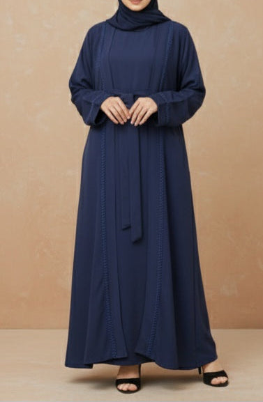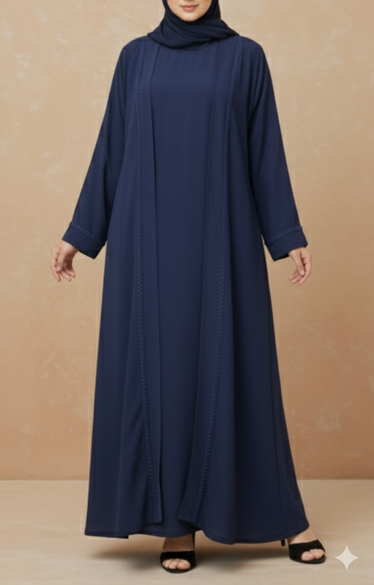 This set includes an open abaya, matching inner slip, optional waist belt, and a perfectly coordinated hijab — ideal for both everyday elegance and special gatherings.