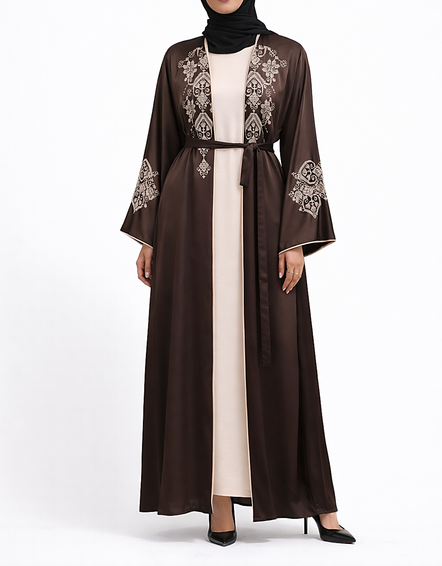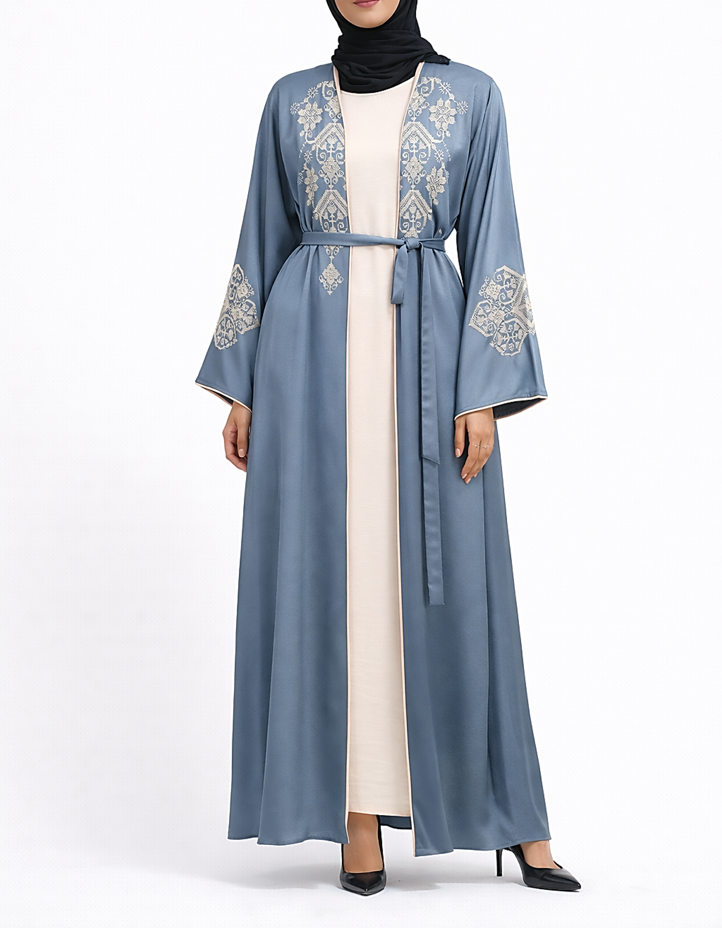 The open abaya features a smooth satin-feel finish, while the inner slip is made from soft crepe fabric for comfort and breathability. Delicate floral embroidery threadwork runs along the front panels and sleeves, perfectly colour-matched with the piping for a cohesive, elevated look. The intricate detailing gives a subtle Ramadan/Eid vibe — modest, feminine and occasion-ready.