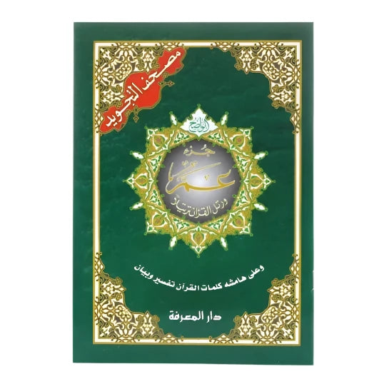 This product covers Juz Amma (Part 30) of the Holy Quran. The publishers have designed the text to show the rules of tajweed when reading the Qur'an. The text is written in Uthmani style and has case vowelization and dotting on the letters that are audible. Letters related to tajweed rules are distinguished within the text by the use of colors, indicating the various tajweed rules. This technique helps simplify the rules of recitation for the reader in order to encourage and facilitate correct Quranic recitation. The text is color-coded: grey indicates when a letter is not pronounced, red indicates letters which require expanded vocalization, green indicates nasalization and blue shows the emphatic pronunciation of the letter.