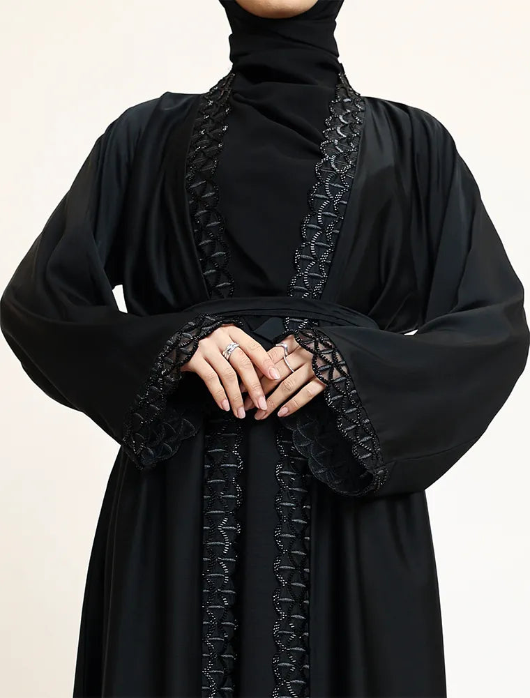 Crafted from luxurious, lustrous satin, the Miral two-piece abaya set drapes beautifully to create an effortlessly elegant and modest silhouette. Designed for both comfort and sophistication, the flowing outer abaya is finished with a delicate lace sequin trim along the front and cuffs, adding a subtle shimmer and refined touch to this timeless design.