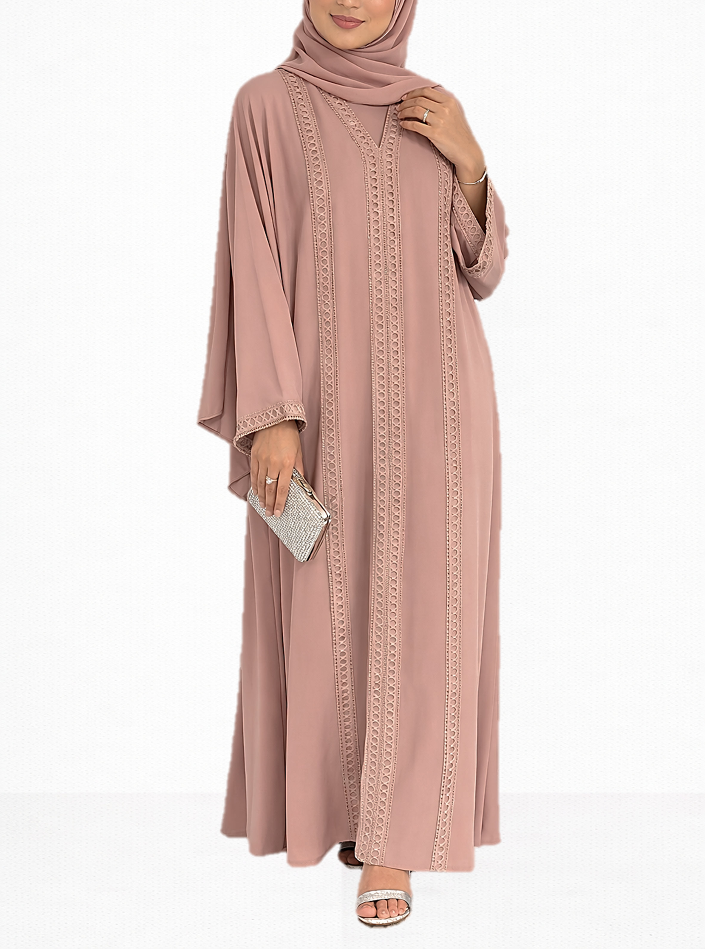 The Jamilah Lace Insert Abaya is a beautifully elegant piece designed for effortless modest style. Crafted from a buttery soft fabric, this abaya offers a smooth and comfortable feel while maintaining a graceful, flowing silhouette. Delicate lace insert detailing runs along the front of the abaya and continues on the sleeve cuffs, adding a refined and feminine touch.