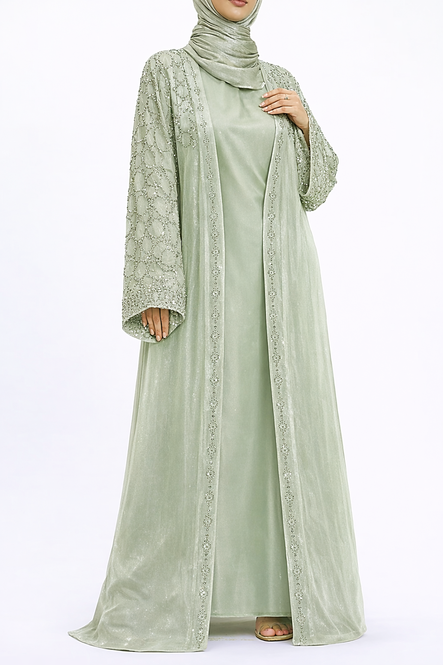 Sage Dina Embellished Sparkle Organza Two-Piece Abaya