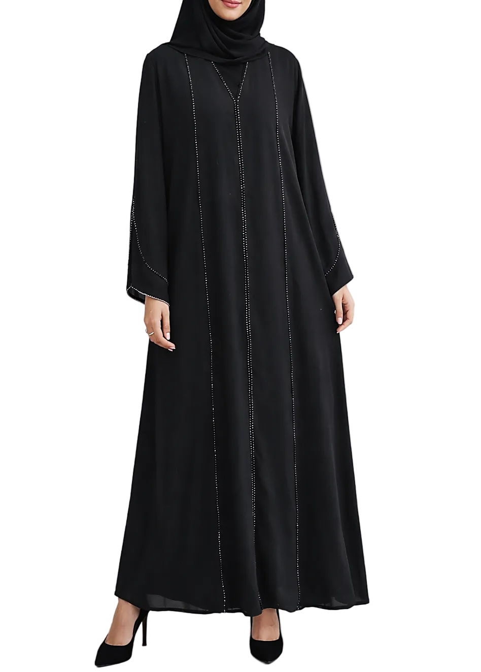 Crafted from lightweight chiffon, this abaya offers a soft, airy drape that flows beautifully with every step. The design features striking open cut-out panelling, delicately outlined with glossy black bead embellishments that add dimension and understated shimmer without overpowering the look. Open abaya with pop buttons.