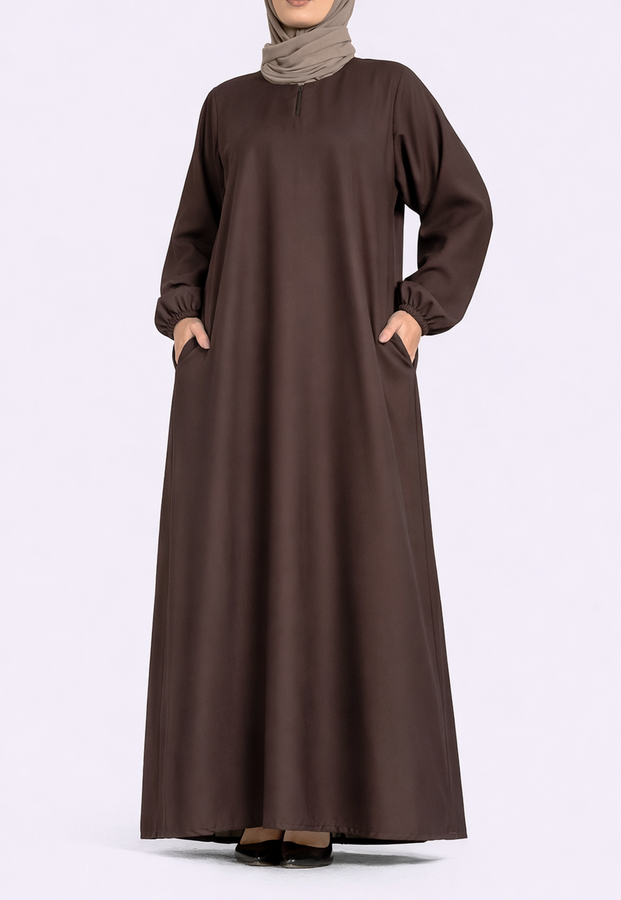 A Ramadan essential you can never go wrong with. Featuring a round neckline with a single button opening. This abaya although simple will meet your expectations for your everyday comfort. This dress features an A-line cut flared bottom with pockets on both sides for your essentials.