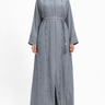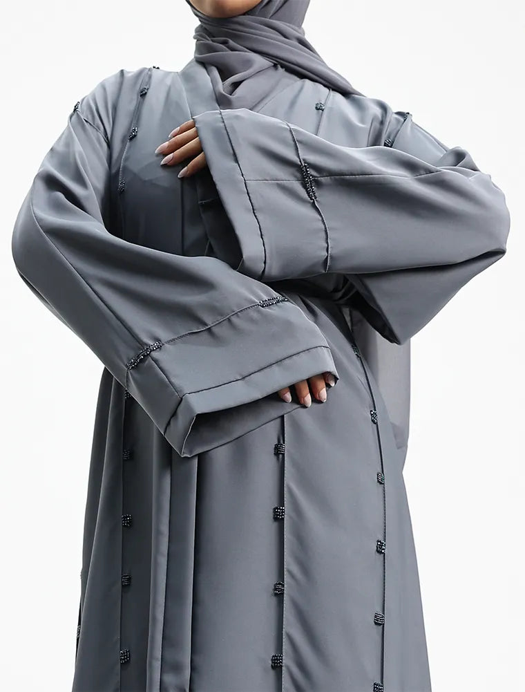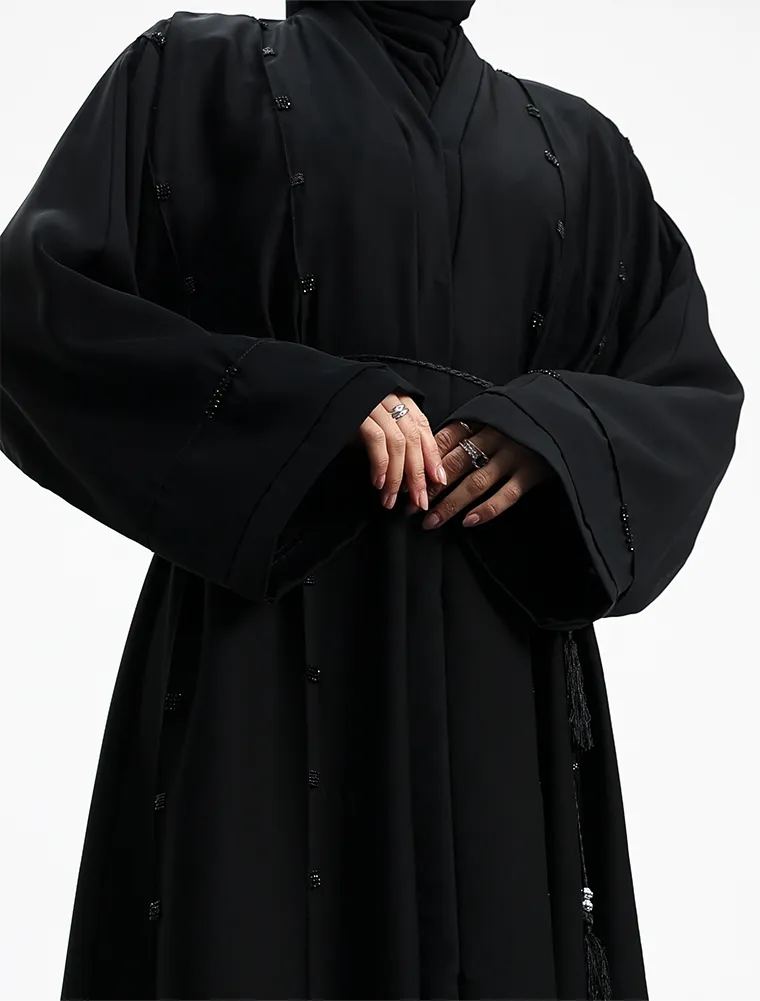 The Jihan Abaya is designed with understated elegance, featuring a clean front opening secured with hidden press buttons running seamlessly from top to bottom for a smooth, refined finish. Thoughtfully placed pintuck detailing enhances the silhouette, while delicate hand-beadwork adds a subtle touch of craftsmanship and sophistication.
