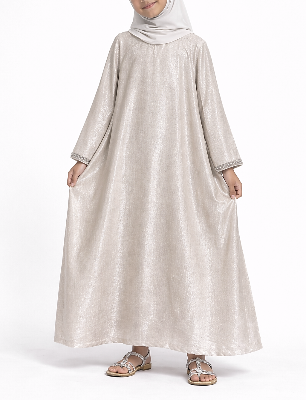 Designed in a graceful batwing silhouette, this abaya drapes effortlessly for a soft, elegant look that moves beautifully with every step. The fabric has a unique powdery-soft feel with a subtle shimmery finish and an iridescent glow that catches the light gently, giving the abaya a refined, luminous appearance without being overpowering
