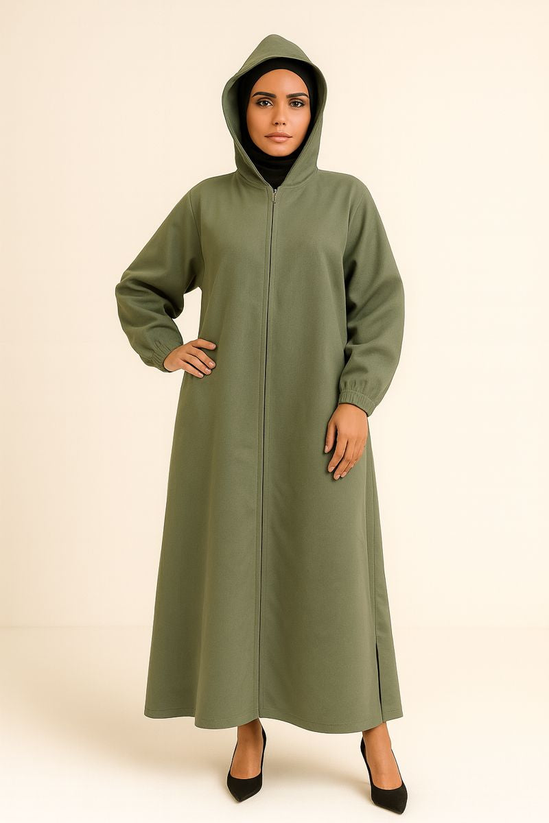 Stay warm without compromising on modesty with our Woollen Hoodie Zip Abaya. Designed for comfort and everyday wear, this abaya features a full front zip and an attached hood for added practicality.
