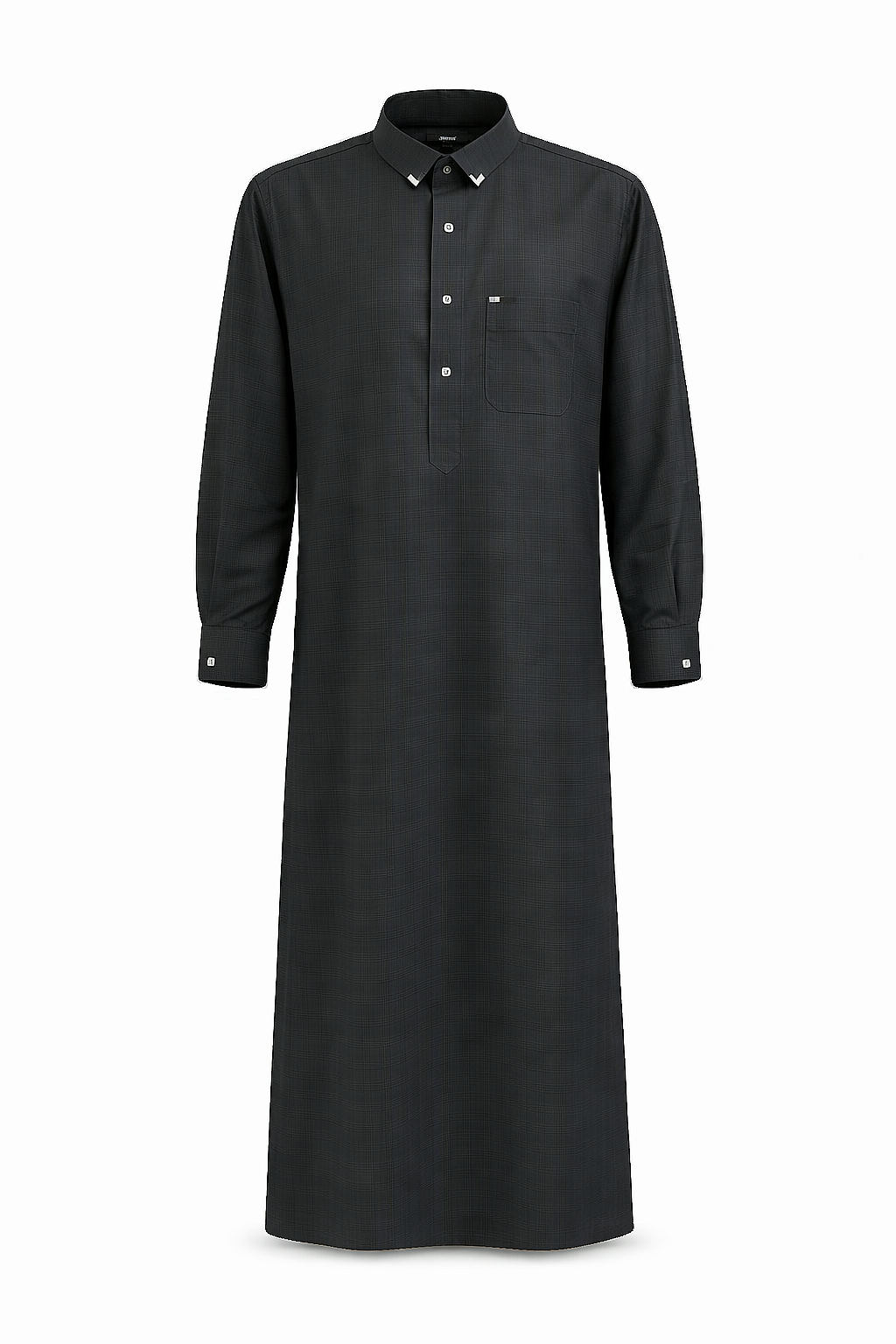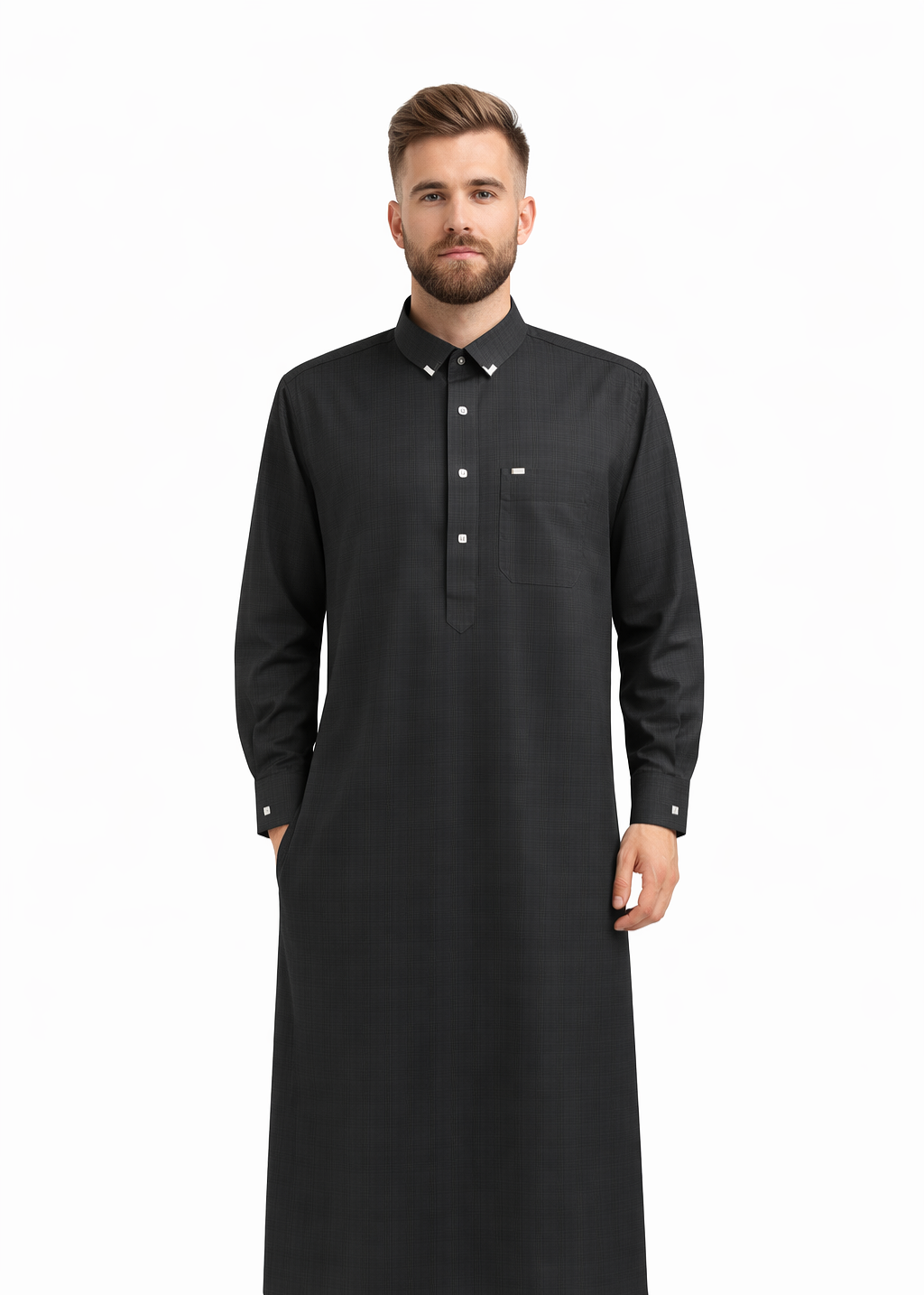 The thobe also includes a chest pocket and two side pockets, combining practicality with timeless style.