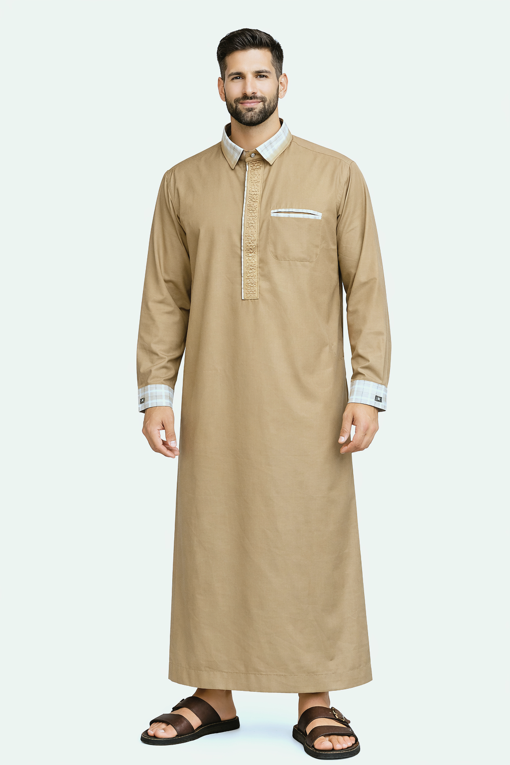 Elevate your everyday modest wear with our Checkered Collar Thobe, designed with a perfect balance of classic elegance and modern detailing. Crafted with a clean straight-cut silhouette, this thobe offers both comfort and sophistication, making it ideal for daily wear, Jummah, Eid, or special occasions.