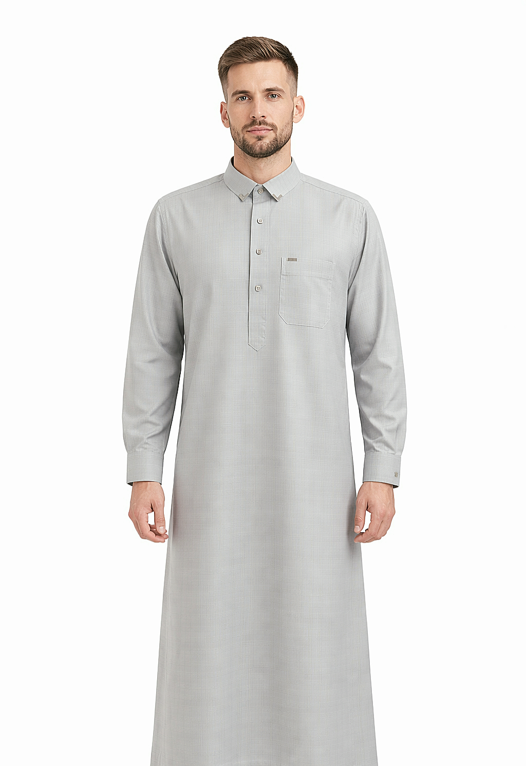 The thobe also includes a chest pocket and two side pockets, combining practicality with timeless style.