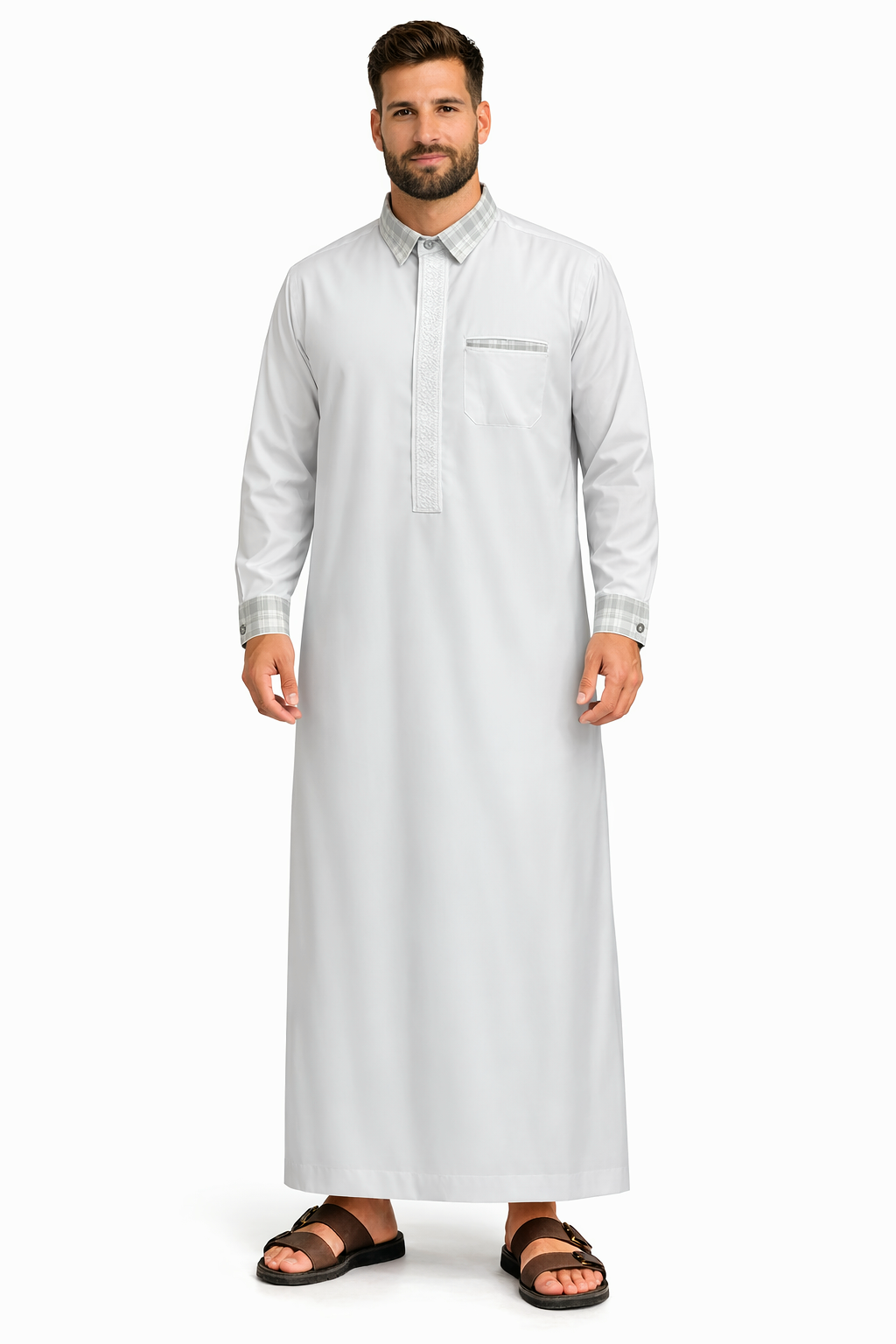 Elevate your everyday modest wear with our Checkered Collar Thobe, designed with a perfect balance of classic elegance and modern detailing. Crafted with a clean straight-cut silhouette, this thobe offers both comfort and sophistication, making it ideal for daily wear, Jummah, Eid, or special occasions.