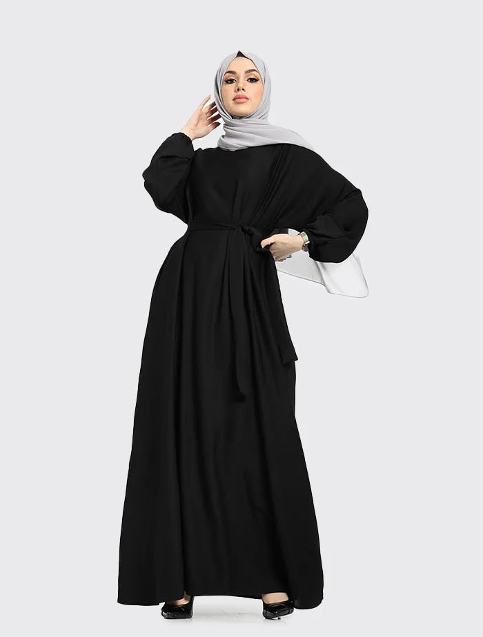 Another basic abaya which you can't go wrong with, although simple it will meet your expectations for your everyday comfort⋅ This dress features an A-line cut flared bottom with pockets on both sides for your essentials, elasticated cuffs to give a slight puff look⋅ A separate belt is included to give a more structured look or you can just opt for the more casual look without it⋅