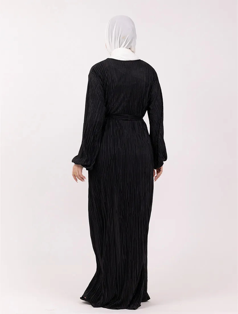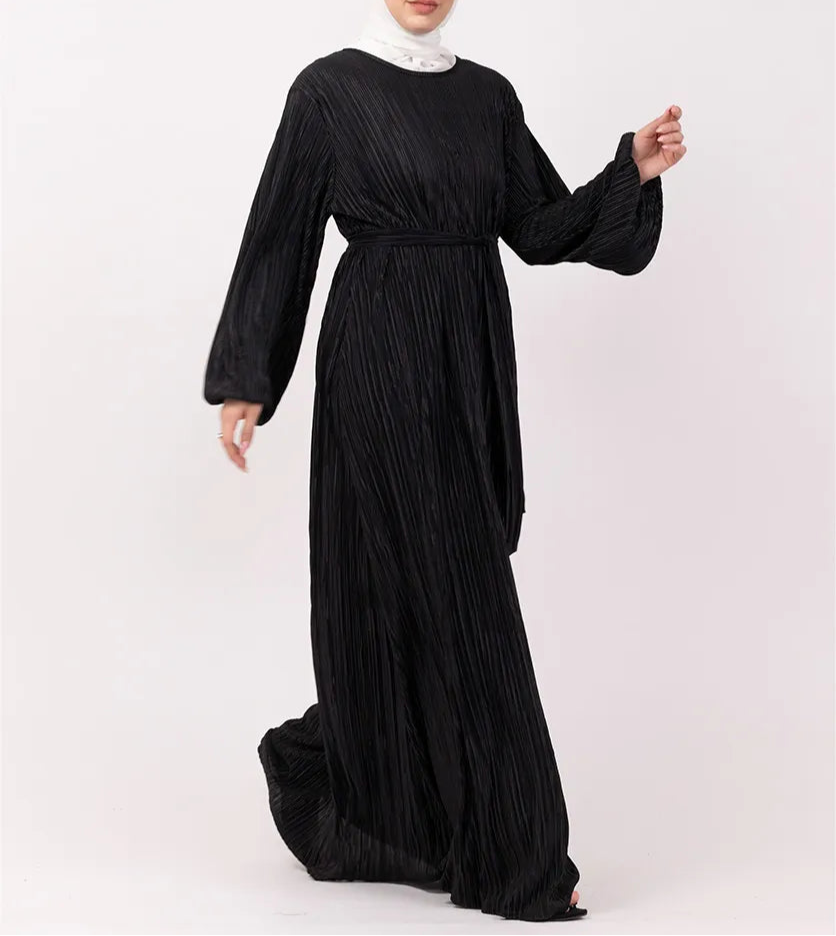 Step into timeless elegance with this beautifully designed black pleated abaya. Crafted from lightweight, flowy fabric with a crinkle texture, this abaya features: