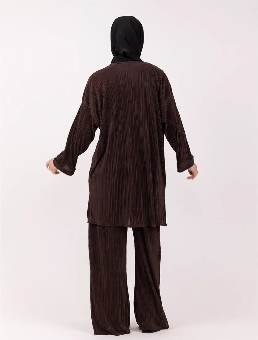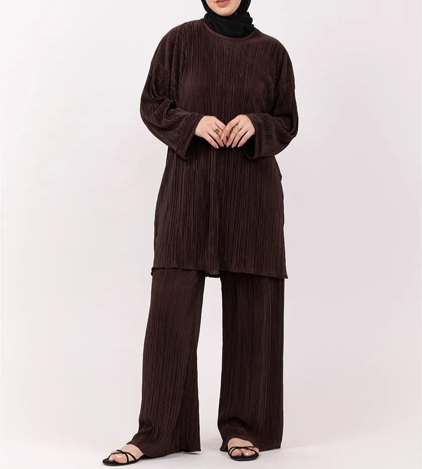Effortlessly chic and comfortable, this crinkle-textured co-ord set is the perfect blend of relaxed style and elevated everyday wear. The set features a longline top and wide-leg trousers, designed with flow and movement in mind.