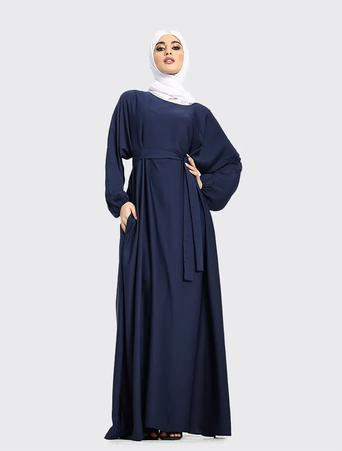 Another basic abaya which you can't go wrong with, although simple it will meet your expectations for your everyday comfort⋅ This dress features an A-line cut flared bottom with pockets on both sides for your essentials, elasticated cuffs to give a slight puff look⋅ A separate belt is included to give a more structured look or you can just opt for the more casual look without it⋅