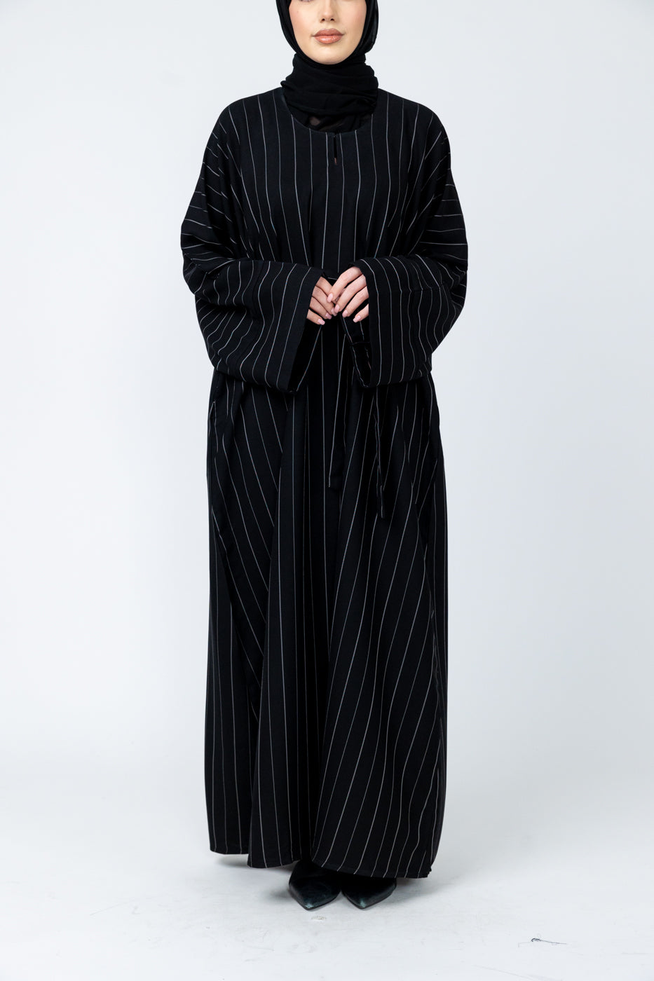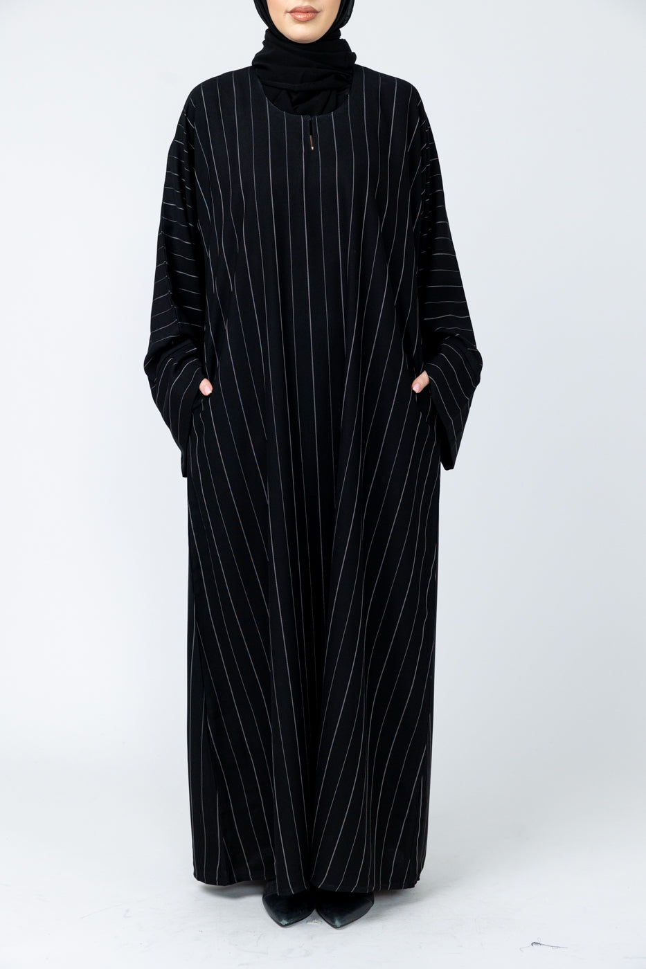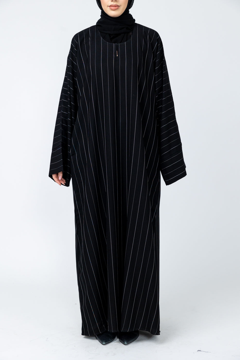 A simple yet classy, loose, closed abaya with textured, stripe detailing. A great item for everyday wear with that extra something.