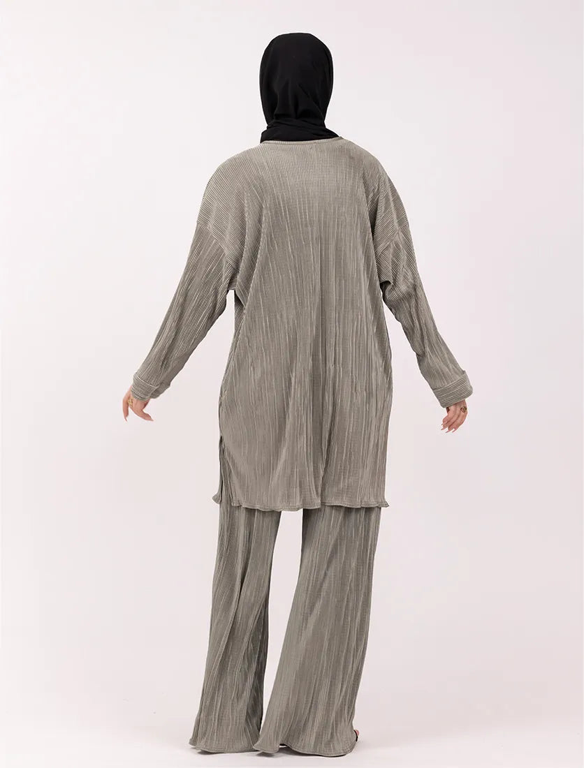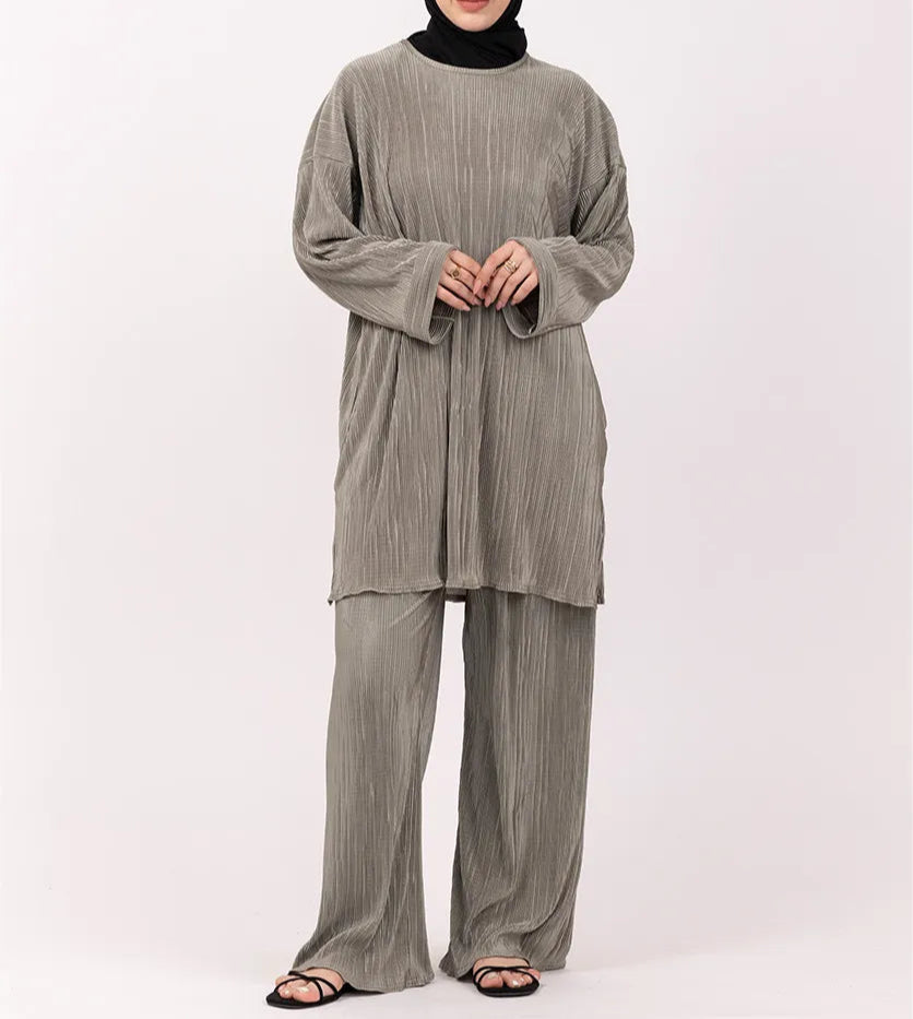 Effortlessly chic and comfortable, this crinkle-textured co-ord set is the perfect blend of relaxed style and elevated everyday wear. The set features a longline top and wide-leg trousers, designed with flow and movement in mind.