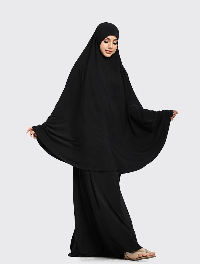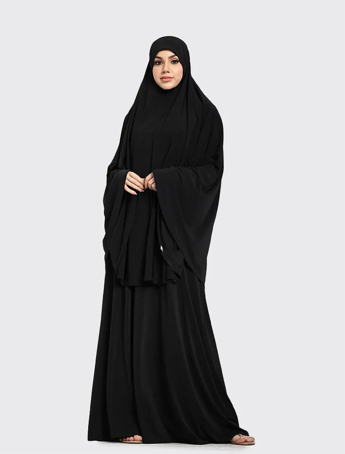 This Jersey Burkah and Skirt set is ideal for prayers or day wear. It is a Pull-on Hijab which drapes from the head and is made from a high-quality jersey fabric.