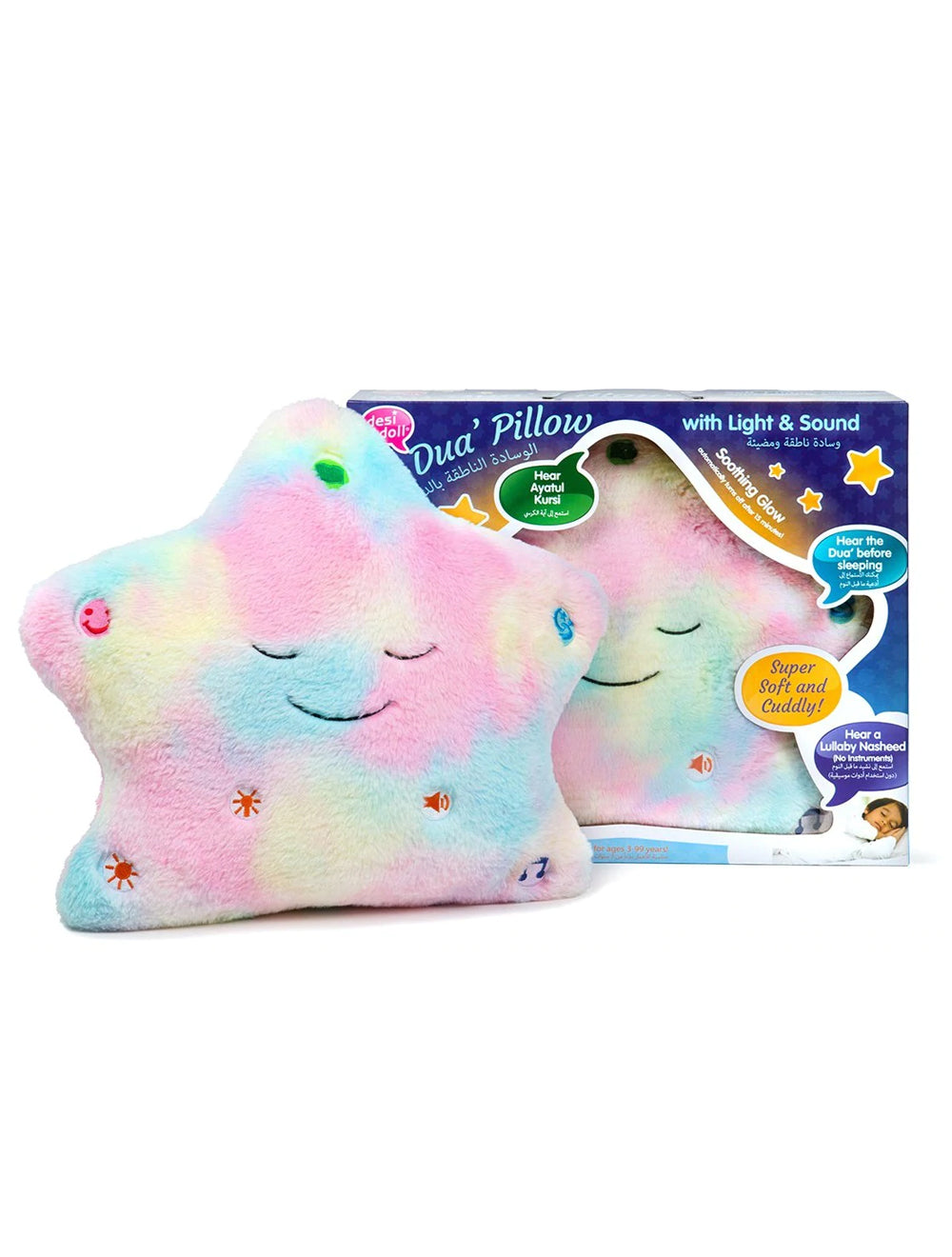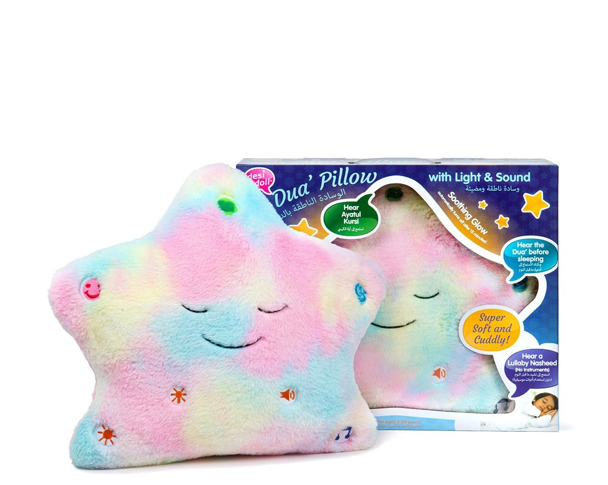 Child-safe LED lights and over six minutes of sound combine in Desi Doll Company’s original My Dua’ Pillow allows your child to hear nighttime dua’s/supplications and a soothing lullaby to make bedtime easier, and more fun than ever!