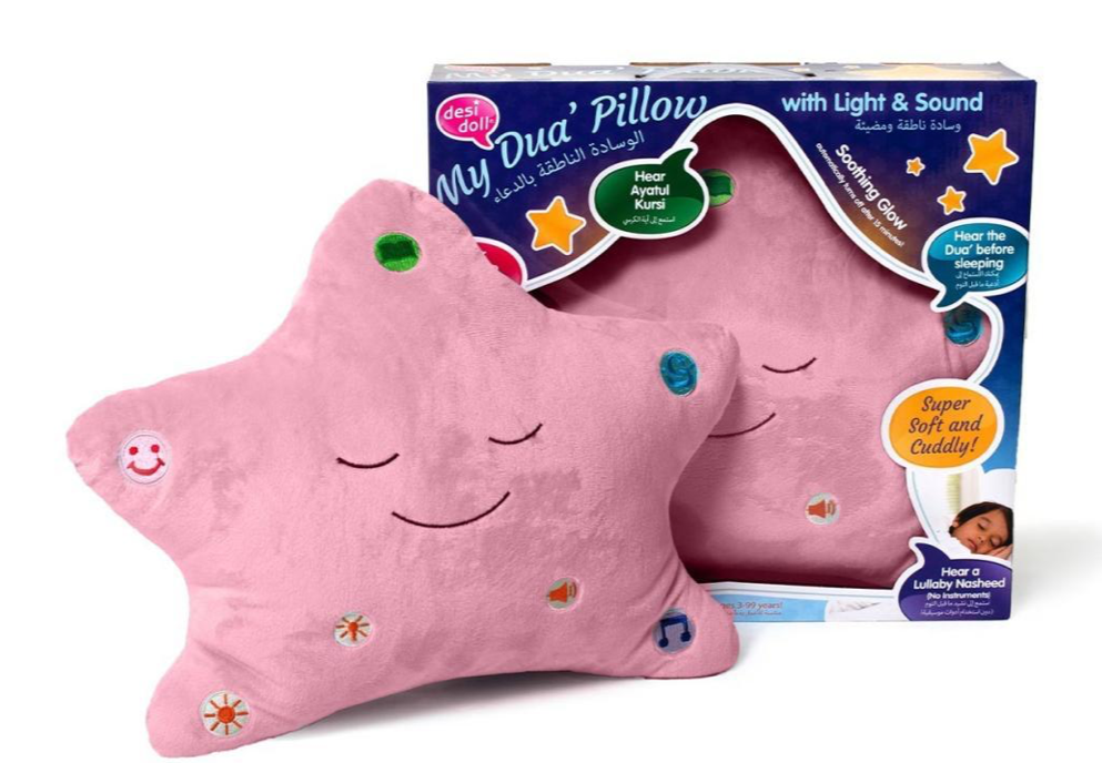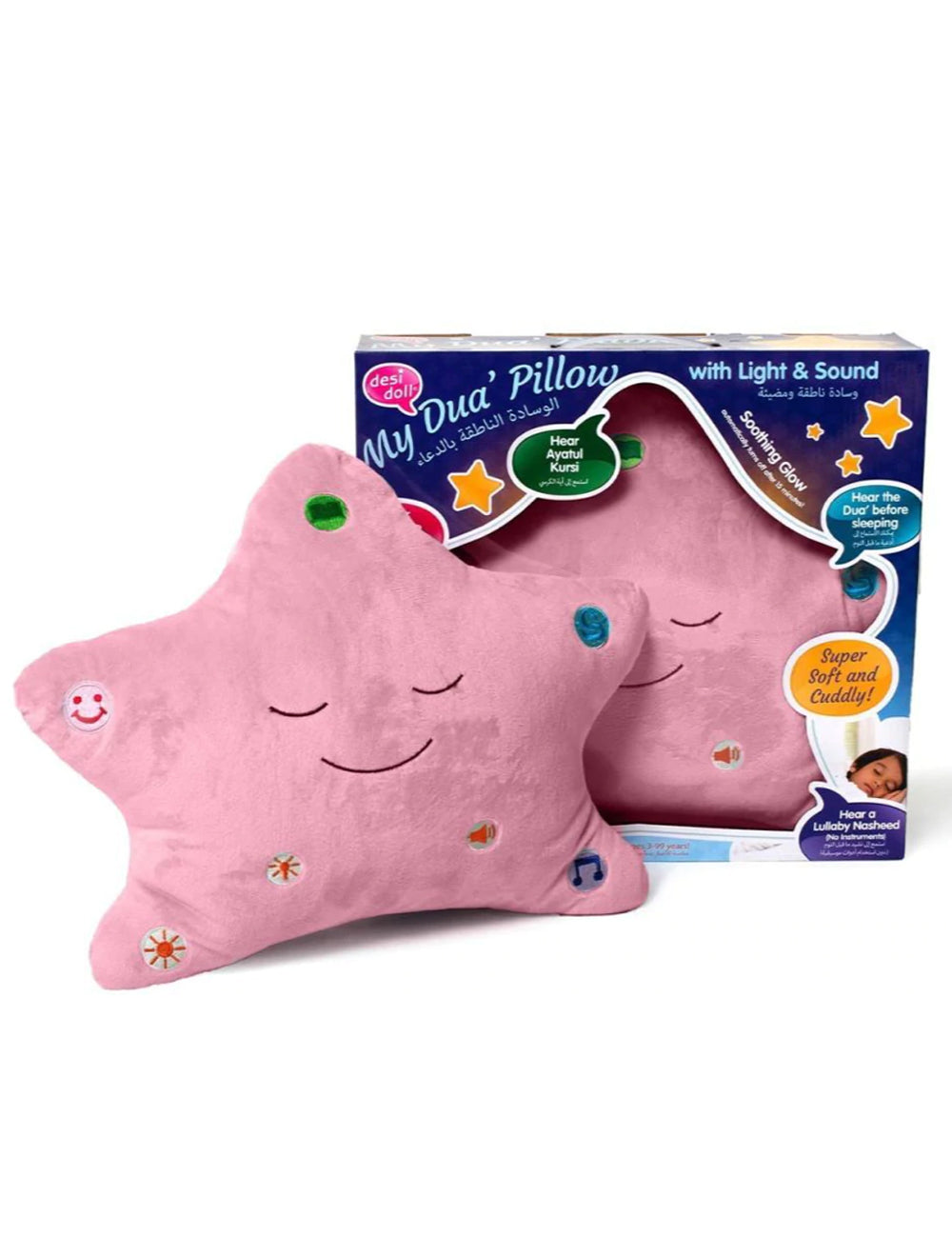 Child-safe LED lights and over six minutes of sound combine in Desi Doll Company original My Dua Pillow allows your child to hear nighttime dua supplications and a soothing lullaby to make bedtime easier and more fun than ever!