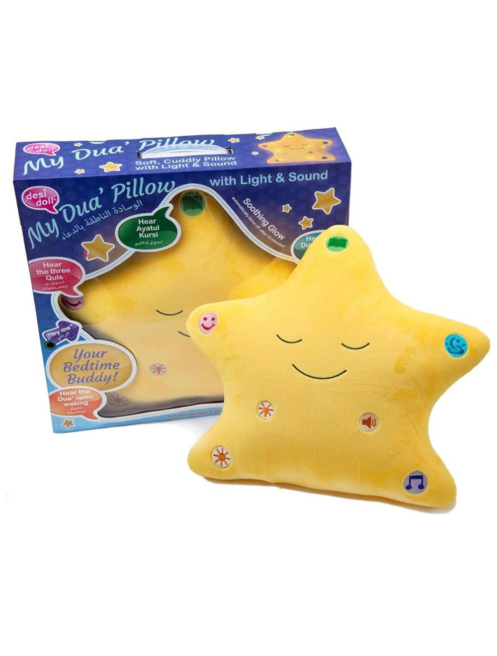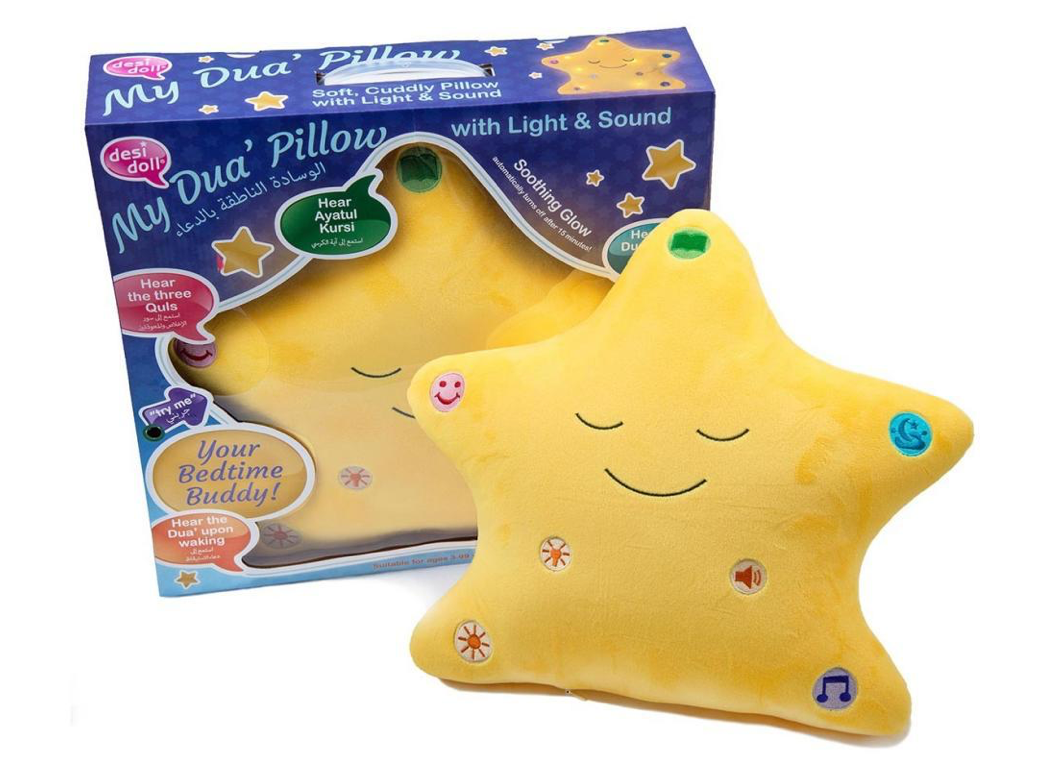 Child-safe LED lights and over six minutes of sound combine in Desi Doll Company original My Dua Pillow allows your child to hear night time dua supplications and a soothing lullaby to make bedtime easier, and more fun than ever!