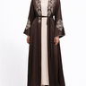 This beautifully crafted 2-piece open abaya set includes a matching crepe inner slip dress and a detachable belt, allowing you to style it structured at the waist or wear it loose for a graceful, flowing silhouette. Thoughtfully designed with hidden side pockets for practicality without compromising elegance.