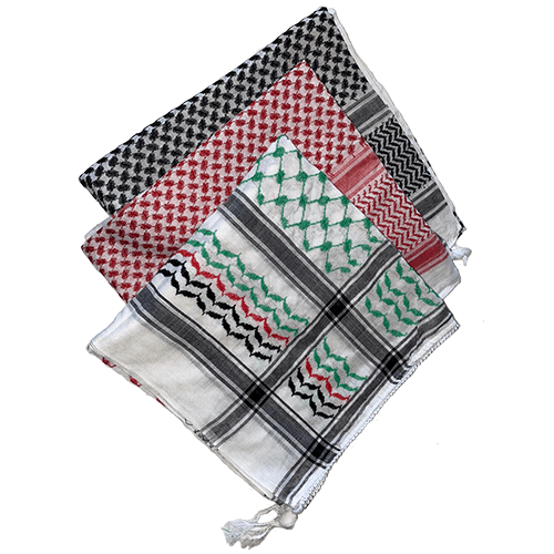 The Palestinian keffiyeh (Arabic: كوفية, koofiyyeh) is a chequered black and white scarf that is usually worn around the neck or head.