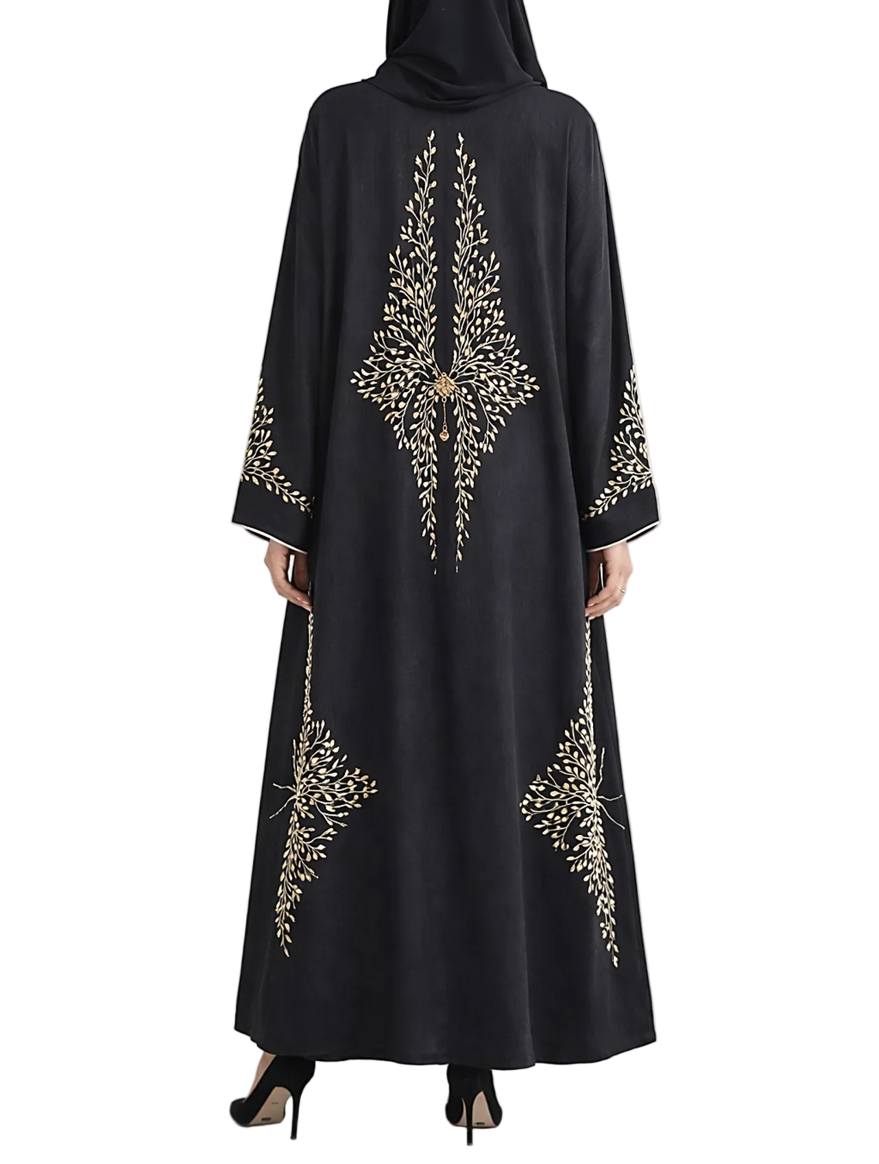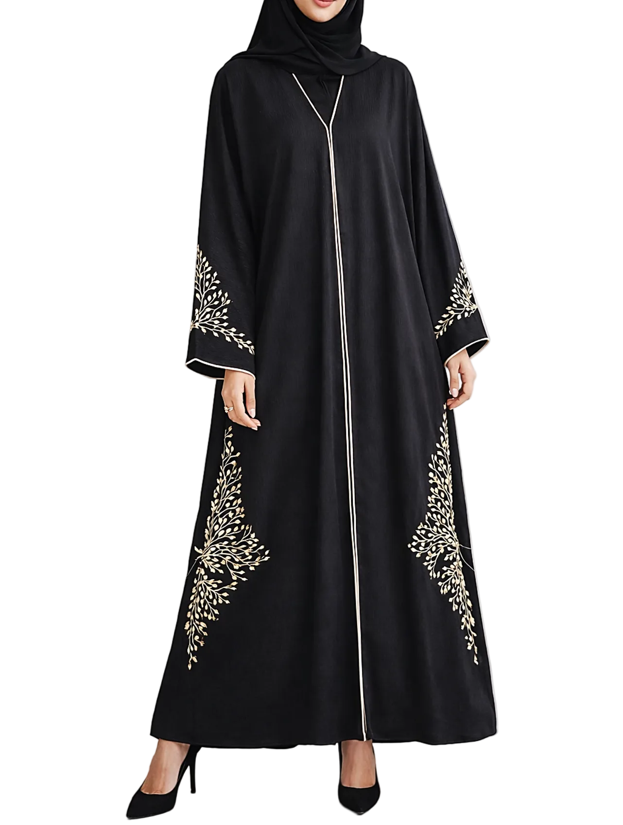 Elevate your wardrobe with our Amina Contrast Embroidered Open Abaya — a timeless piece designed with elegance and refined detail in mind.
