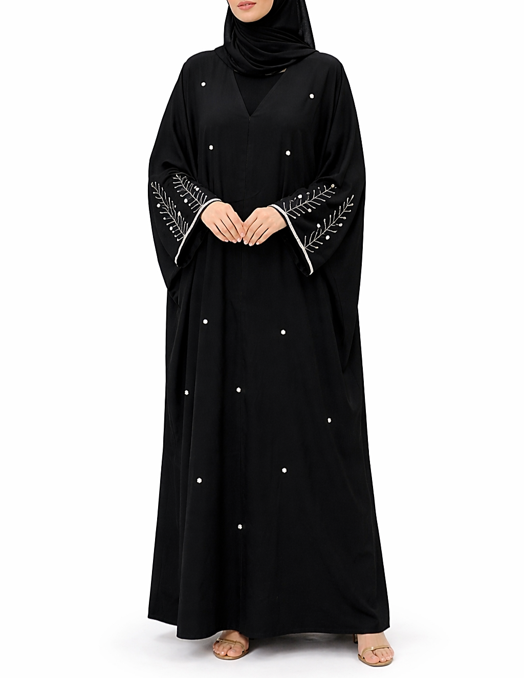The sleeves are adorned with delicate silver and white embellishments, while mini white pearl flower details are scattered across the abaya, adding a soft, feminine touch of luxury without overpowering the design.