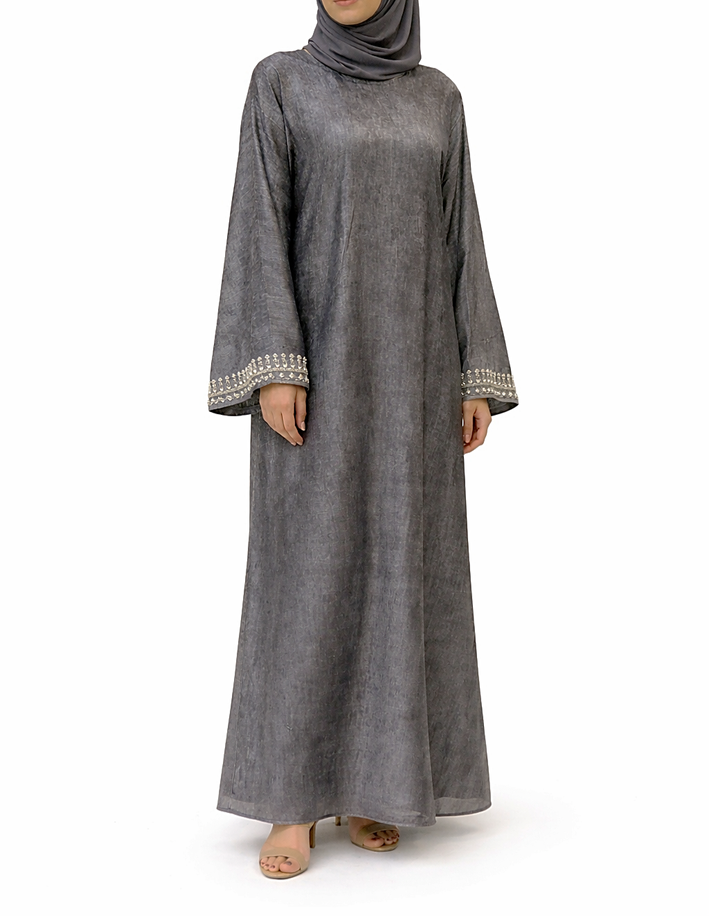 Designed in a graceful batwing silhouette, this abaya drapes effortlessly for a soft, elegant look that moves beautifully with every step. The fabric has a unique powdery-soft feel with a subtle shimmery finish and an iridescent glow that catches the light gently, giving the abaya a refined, luminous appearance without being overpowering.
