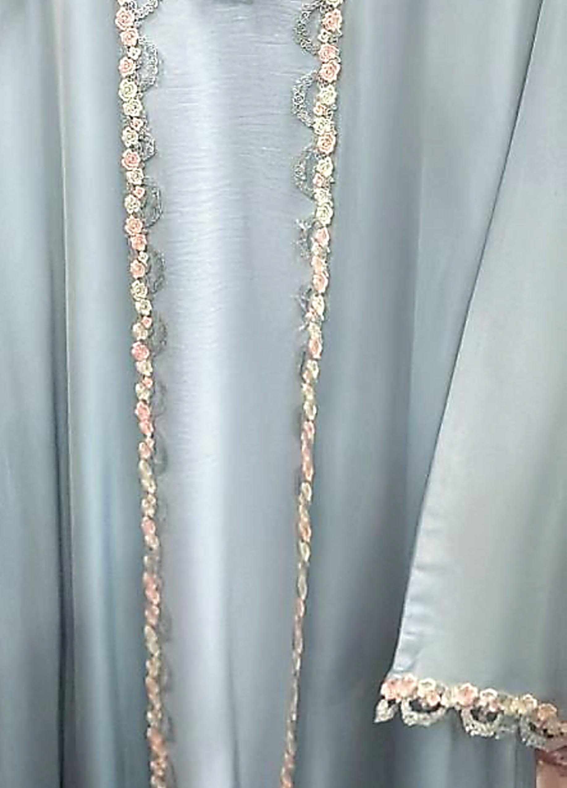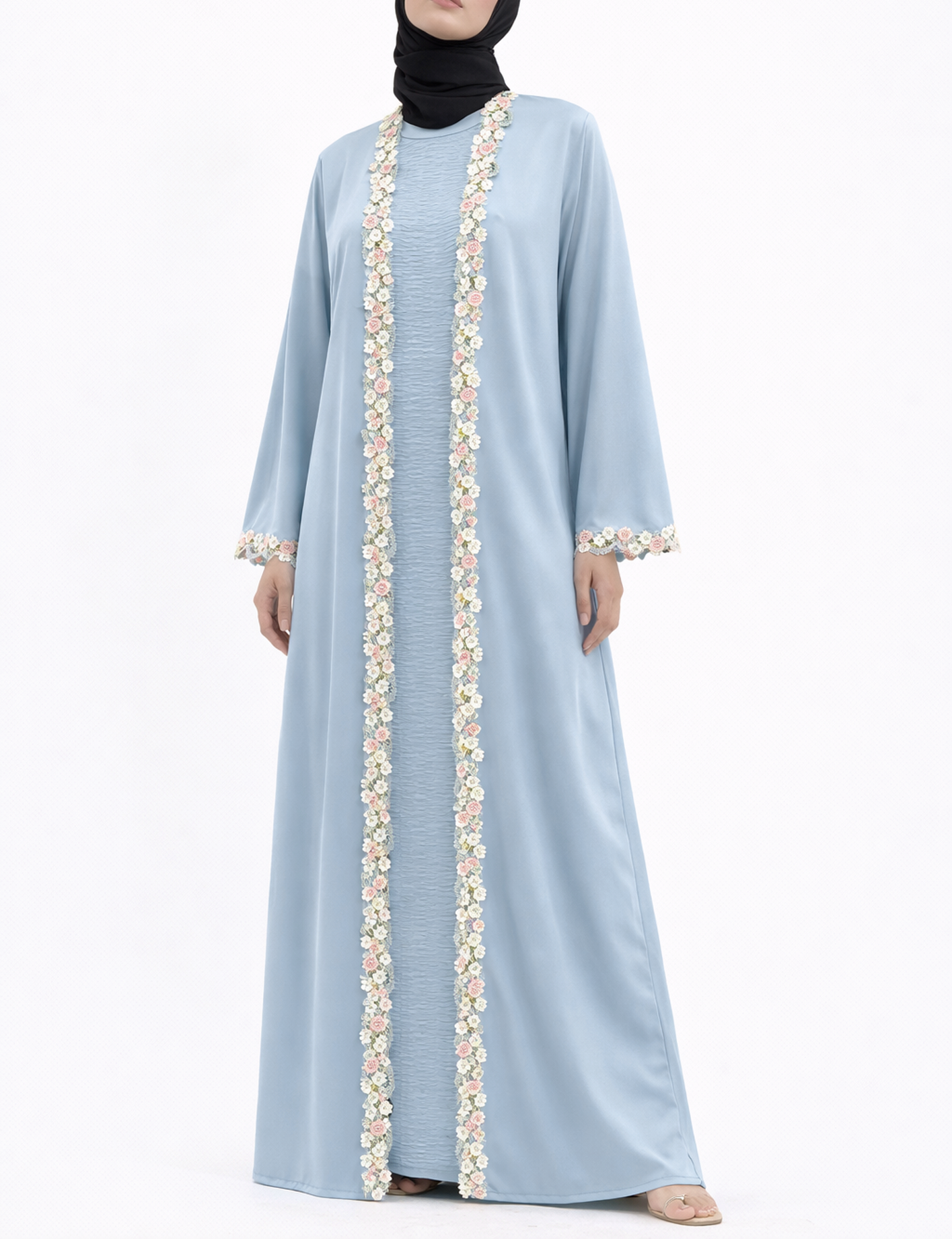The open abaya features delicate floral embellished trims running along the front edges and sleeve cuffs, adding a feminine touch of detail without overpowering the design. The intricate lace is accented with soft floral elements, creating a graceful contrast against the abaya’s silky base.