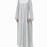 Designed in a graceful batwing silhouette, this abaya drapes effortlessly for a soft, elegant look that moves beautifully with every step. The fabric has a unique powdery-soft feel with a subtle shimmery finish and an iridescent glow that catches the light gently, giving the abaya a refined, luminous appearance without being overpowering.