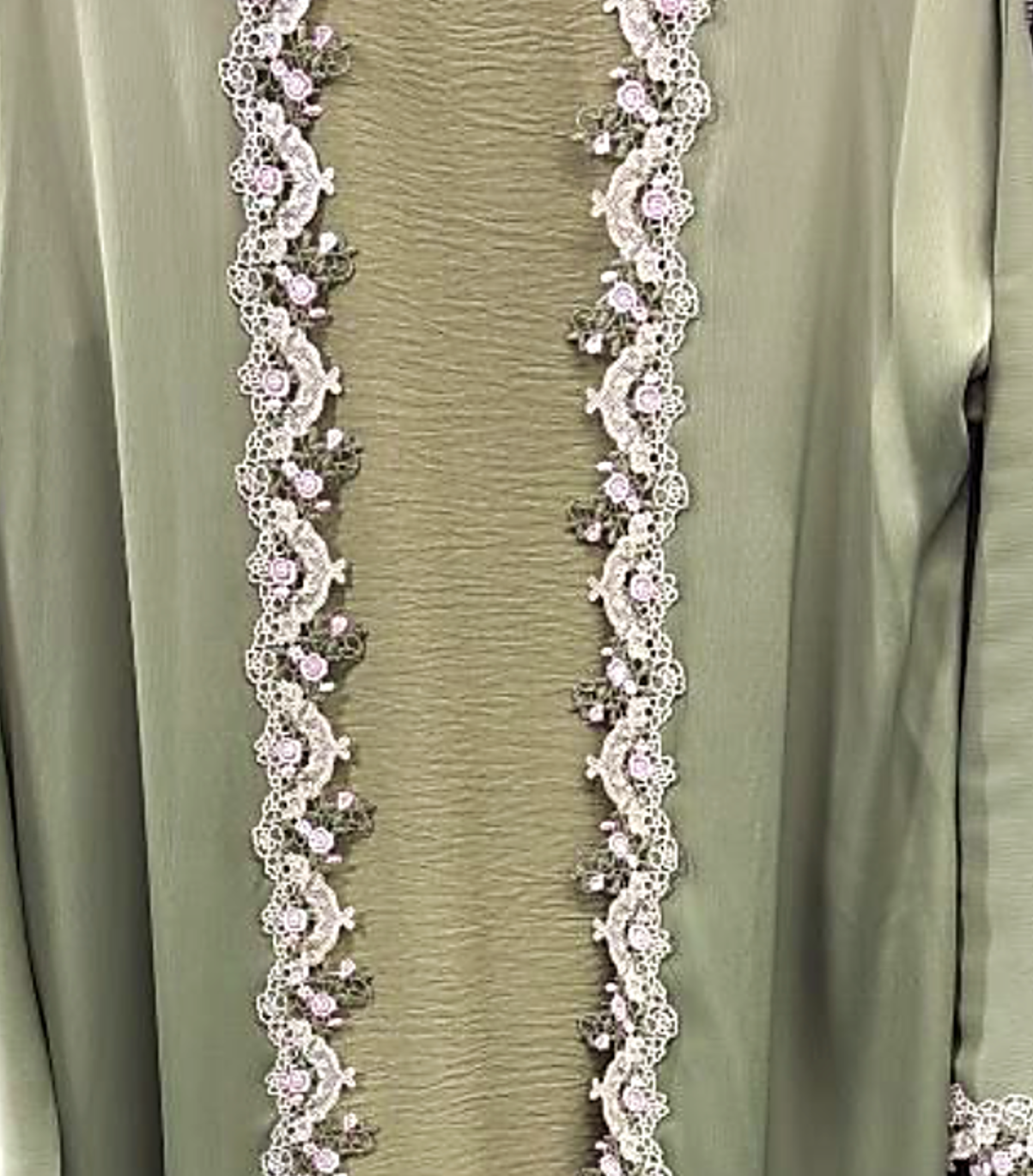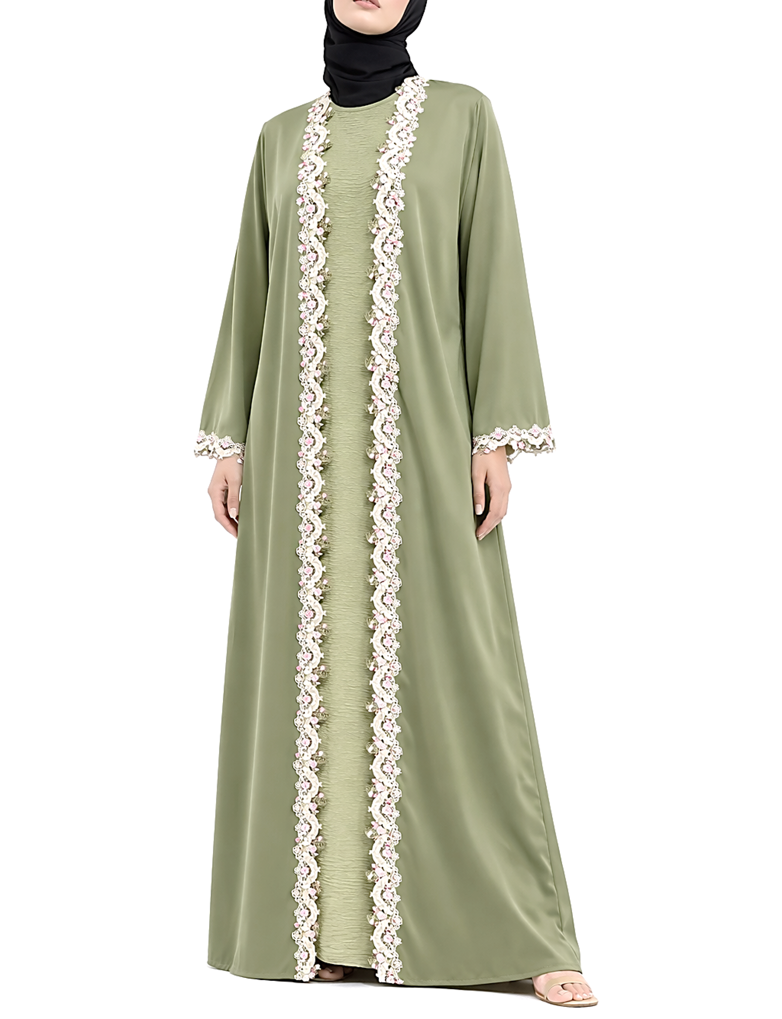 The open abaya features delicate floral embellished trims running along the front edges and sleeve cuffs, adding a feminine touch of detail without overpowering the design. The intricate lace is accented with soft floral elements, creating a graceful contrast against the abaya’s silky base.