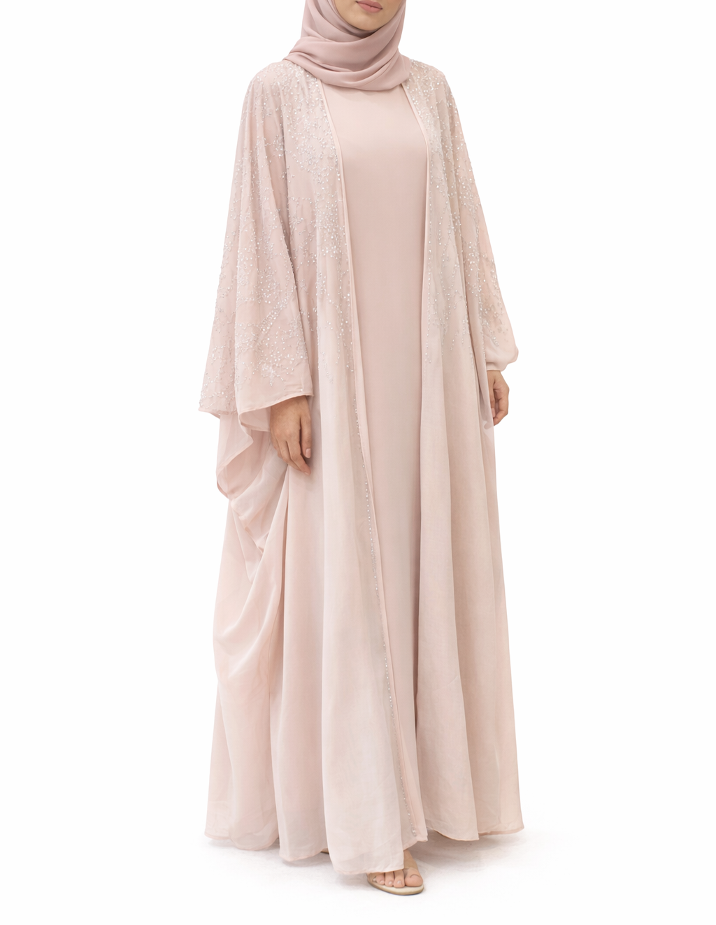 This stunning batwing (farasha) style abaya is crafted from lightweight, semi-sheer organza that drapes beautifully for a soft, flowing silhouette. The top half, shoulders, and sleeves are adorned with delicate silver embellishments, adding a subtle shimmer that catches the light with every movement — perfect for Eid, weddings, and special occasions.