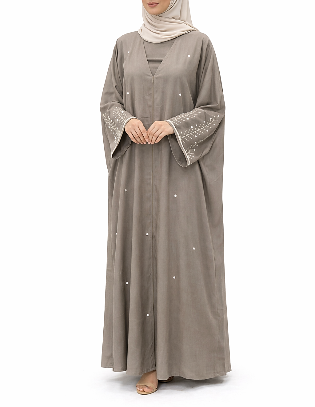 Taupe Embellished Pearl Sleeve Satin Abaya