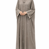 Crafted from a smooth satin-feel fabric similar to satin nida, this abaya offers a graceful drape with a subtle sheen for an elevated, refined look. Designed as an open-style abaya with discreet invisible pop buttons, it can be worn open for a layered look or closed for a sleek, seamless silhouette.